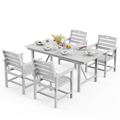 A: Teak outdoor dining sets are among the most durable, thanks to their natural resistance to moisture and pests. Aluminum outdoor dining sets are also a strong, lightweight, and low-maintenance choice.