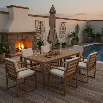 A: Teak outdoor dining sets are among the most durable, thanks to their natural resistance to moisture and pests. Aluminum outdoor dining sets are also a strong, lightweight, and low-maintenance choice.