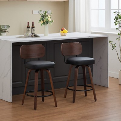 Gulches Mid Century Modern Swivel Bar Stools Set of 2, Upholstered Faux Leather, Black PU, 26"