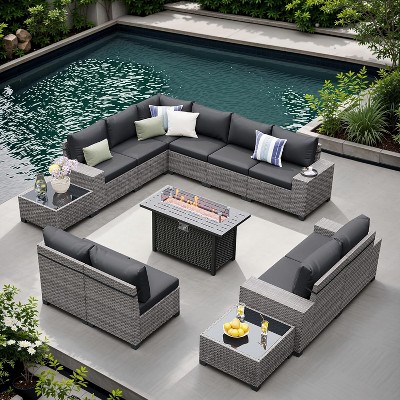 A: Most sets include a mix of seating and tables, such as sofas, chairs, coffee tables, or dining tables. Some collections also feature specialty pieces like loungers or fire pit tables.