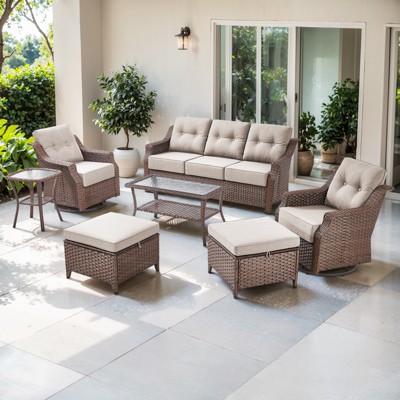 A: Most sets include a mix of seating and tables, such as sofas, chairs, coffee tables, or dining tables. Some collections also feature specialty pieces like loungers or fire pit tables.