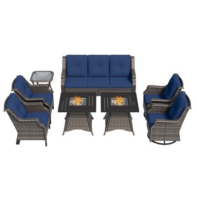 A: Most sets include a mix of seating and tables, such as sofas, chairs, coffee tables, or dining tables. Some collections also feature specialty pieces like loungers or fire pit tables.