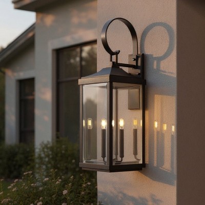 Take your exterior lighting to a whole new level. Lanterns are box-like frames made of glass or other translucent panels that allow light to shine through to create a rustic, timeless vibe. Lanterns can be hung from a hook or bracket, mounted on a post, or placed on a table or that mount to a ceiling are a great option for brightening up a covered porch , entryway , or dining area. Lanterns can be used with both real and flameless candles. Real candles can add a cozy and romantic touch to your outdoor space, while flameless candles provide the same warm glow without the risk of fire. Whether camping or relaxing on your patio, lanterns make a great alternative to brighten up any space.