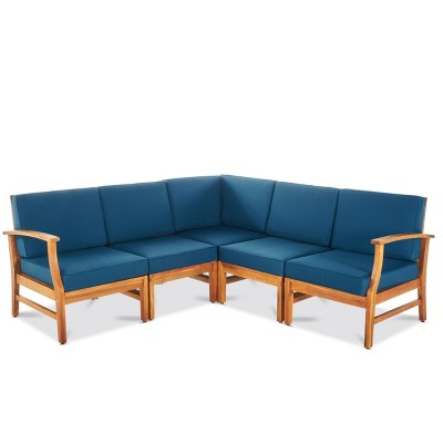 GDFStudio Abena Outdoor Acacia Wood 5 Seater Sectional Sofa Set with Cushions