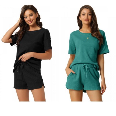 cheibear Women's Waffle Knit Long Sleeve Top and Shorts with Pockets Pajamas Sets 2 Pcs