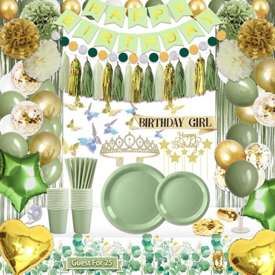 Itopfox 222 Pcs Sage Green Birthday Decorations Kit for Women Girls 25 Guest Disposable Dinnerware Balloons Banner Sash Tiara