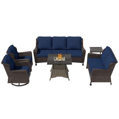 UPTIOT 6-Piece Outdoor Set with 3-Seat Sofa, 2 Swivel Chairs, 2 Single Chairs & 50,000 BTU Brown Fire Table