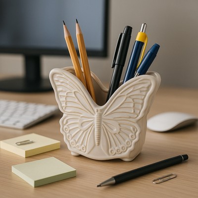Decorative Ceramic Butterfly Shape Desktop Organizer for Home Decor - Compact Small Desk Organizer for Office, Workspaces, or Storage - 4", Ivory