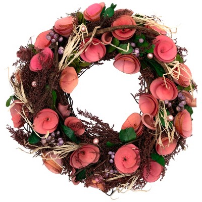 Northlight 12.5" Pink Flowers Berries Green Leaves and Twigs Artificial Floral Spring Wreath