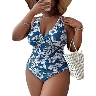 Womens Plus Size Tankini 2 Piece Bathing Suits Sets for Women Summer Crossback Swimsuit Sets Floral Swimwear Faux Wrap Two Piece Blue Swimsuits