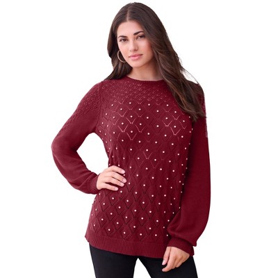 Roaman's Rhinestone Pointelle Knit Sweater