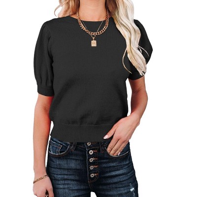 BLUEMING Women's Puff Sleeve Short Sleeve Knit Top Round Neck Essential Lightweight Solid Color Pullover Versatile Knitwear