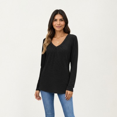 Anna-Kaci Women's Long Sleeve V-Neck Top with Subtle Front Pleat and Relaxed Fit