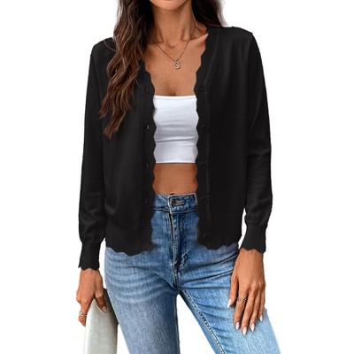 Coolmee Women's Solid Round Neck Open Front Cardigan Sweater Fall Slim Fit Long Sleeve Button Down Knit Crop Sweater