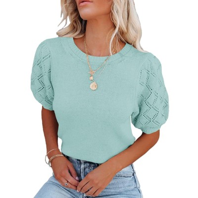 BLUEMING Sweater Tops for Women Short Sleeve Crew Neck Summer Knit Shirt Eyelet Knit Elbow Sleeve Tops