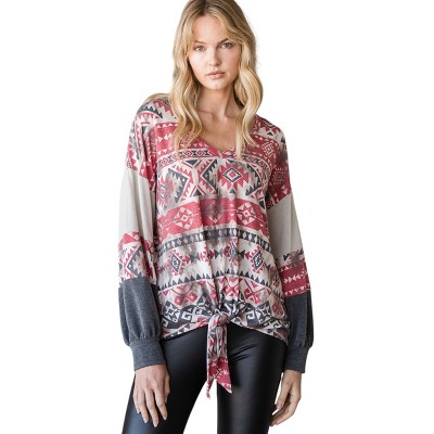 Slickblue Women's Aztec Print V-Neck Sweater, Color Block with Tie Front and Ruffle Sleeves, Red, Size S-L