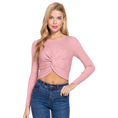 Slickblue Women's Crew Neck Knotted Crop Sweater, Soft Stretch Knit, Cotton Pink Color, Size S-L