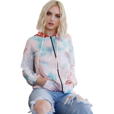 Slickblue Women's Zip-Up Hoodie with Feather and Tie-Dye Print, Plaid Hood Detail, Sage Pink, Size S-L