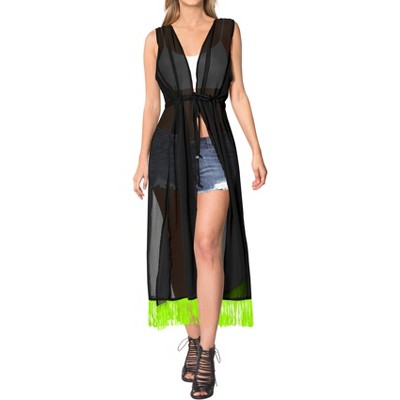 LA LEELA Women's Open Front Summer Holiday Beachwear Long Bathing Suit Duster Solid Vacation Swimwear Coverups Beach Cardigan M-L Black, Solid