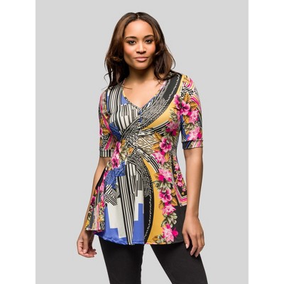 24seven Comfort Apparel Womens Multicolor Floral Print Elbow Sleeve V Neck Henley Tunic Top