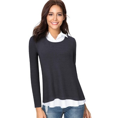 Women's Long Sleeve Contrast Collared Shirts Patchwork Work Blouse Tunics Tops