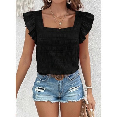 Womens Square Neck Summer Pullover Top Ruffle Short Sleeve Casual Shirts