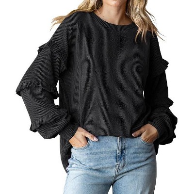 Women's Round Neck Lantern Sleeve Ruffled Pullover, Casual Long-Sleeve Top
