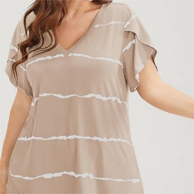 Coolmee Women’s Plus Size Tops Summer Basic V Neck Striped T Shirts Ruffle Short Sleeve Casual Loose Fit Cute Tee Clothes Fashion Outfits 4XL Khaki