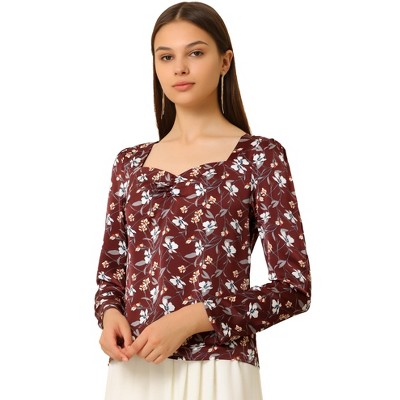 Allegra K Women's Floral Long Sleeve Sweetheart Neck Peplum Blouse with Belt