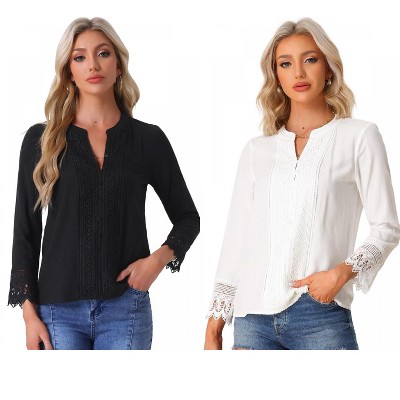 INSPIRE CHIC Women's Half Button Placket Long Sleeve Lace Crochet Boho Blouse 2 Packs
