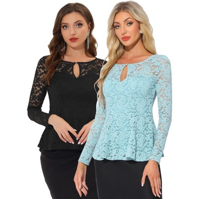 INSPIRE CHIC Women's Floral Lace Front Peplum Hem Keyhole Sheer Long Sleeve Blouse 2 Pieces