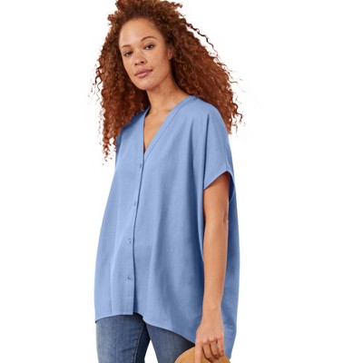 Lands' End Women's Linen Blend Short Sleeve Button Front Polo Top