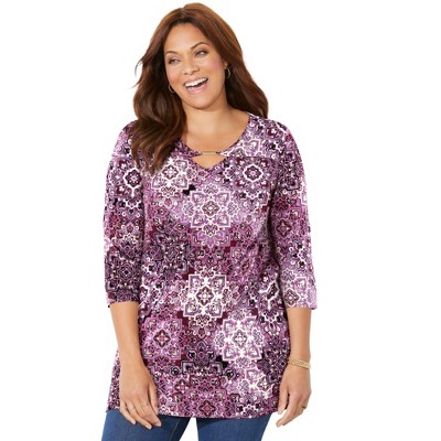 Woman Within Perfect Printed Three-Quarter-Sleeve Scoopneck Tunic