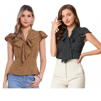 Allegra K Women's Polka Dots Flat Collar Contrast Tie Neck Short Sleeve Blouses