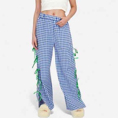Anna-Kaci Lounge Women's Gingham Wide Leg Pants with Elastic Waistband Contrast Side Ribbon Tie Details Design