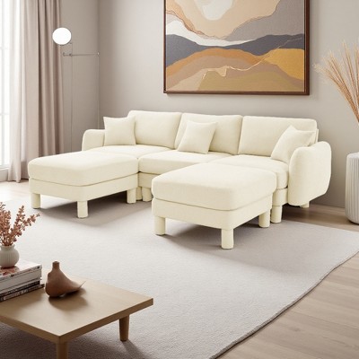 Boucle U-Shaped Sectional Sofa with Shell Armrests & 2 Ottomans