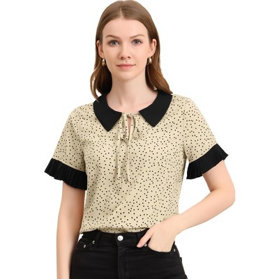 Allegra K Women's Contrast Doll Collar Polka Dots Short Sleeves Blouse