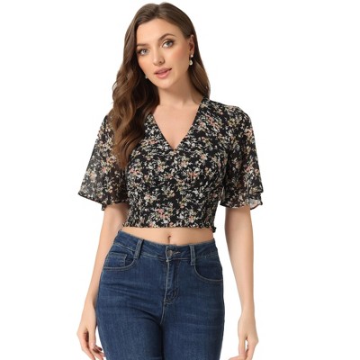 INSPIRE CHIC Women's Floral Flare Short Sleeve V Neck Summer Smocked Crop Tops