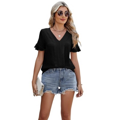 Womens V Neck Ruffle Short Sleeve Blouse Casual Summer Shirts Top