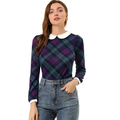 Allegra K Women's Plaid Gingham Puff Short Sleeve Peter Pan Collar Button Down Shirt