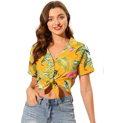 Allegra K Women's Hawaiian Floral Leaves Printed Short Sleeve Button Down Vintage Shirt