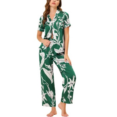 cheibear Christmas Family Tree Print Button Down Top and Pants Satin Pajama Sets Red