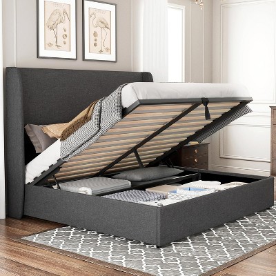 AMERLIFE Bed Frame with Lift Up Storage,Linen Upholstered Platform Bed,Wingback Headboard