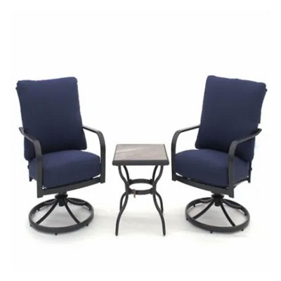 Four Seasons Courtyard Brookfield 3 Piece Deep Seating Patio Chat Set, Includes 2 Swivel Rockers with Olefin Cushions and Tile Table, Navy