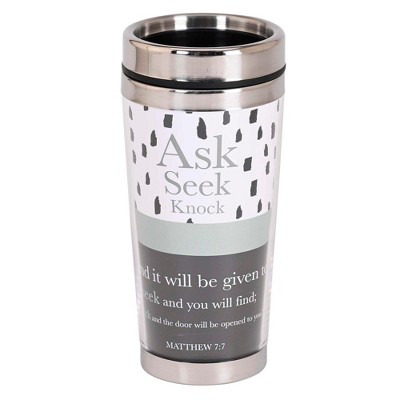 Dicksons SSMUG-365 Ask Seek Knock It Will Be Given To You Silver, White, And Black 16 Ounce Stainless Steel Travel Mug Tumbler With Screw On Sliding