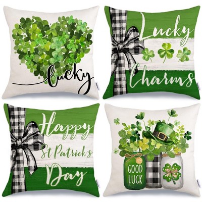 Waterproof St. Patrick's Day Pillow Covers 18 x 18 Inch Set of 4, Green Shamrock Heart Lucky Charm