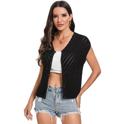 Women's Lightweight Crochet V-Neck Vest with Cap Sleeves Ribbed Trim