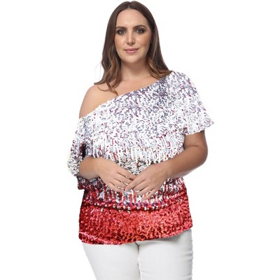 Anna-Kaci Plus Size Sequin One Shoulder Short Sleeve Sparkle Party Top