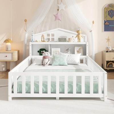 Full Size Wood Floor Bed Frame with Fence for Kids or Teens Bedroom