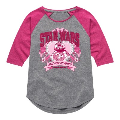 Girls' - Star Wars - Valentine Bb8 Yoda and friends Collegiate Shirt Tail Raglan Graphic T-shirt